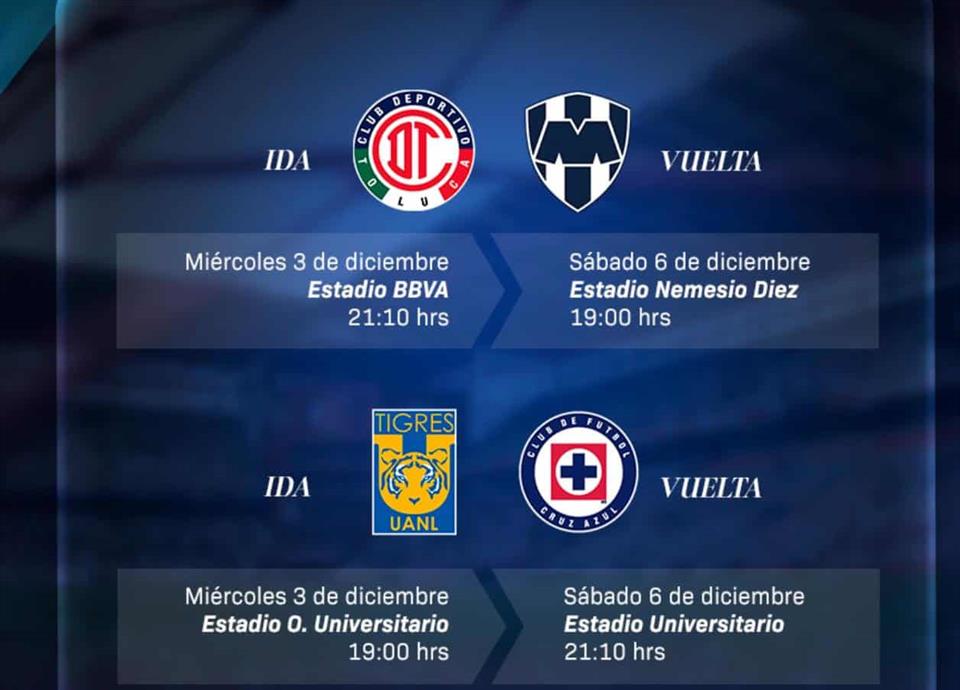 A su vez, la semifinal de ida entre Cruz Azul y Tigres será el próximo miércoles en el estadio Olímpico Universitario de la capital del país, a las 19:00 horas.