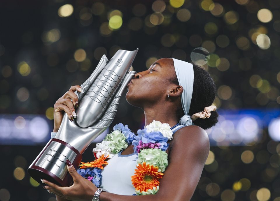 La tenista estadounidense Coco Gauff se alzó este domingo con la mano en alto tras coronarse en el torneo de Wuhan.