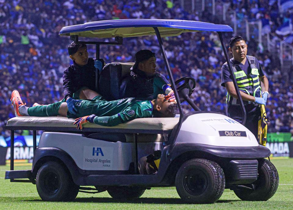 Kevin Mier abandonó el Estadio Cuauhtémoc en el carrito de asistencias con el rostro cubierto.