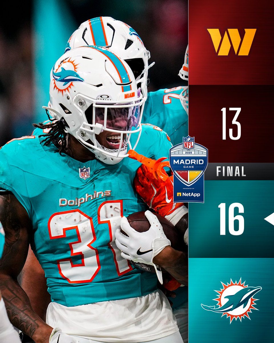 MÉXICO.- En la visita de la NFL a Madrid, España, los Delfines de Miami vencieron 16-13 a los Comandantes de Washington en la semana 11 del futbol americano profesional de Estados Unidos.