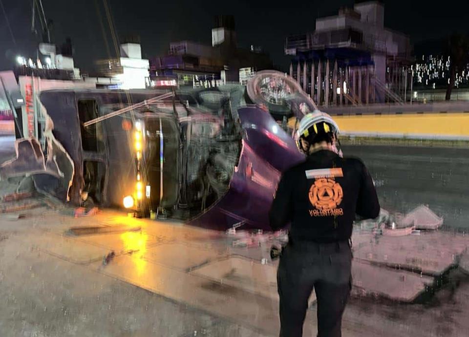 Después de que la unidad carga se volcó, alcanzó a pegarle a una máquina de bomberos que rellenaba agua en un hidrante, además derribó una luminaria que quedó atravesada en la calle.
