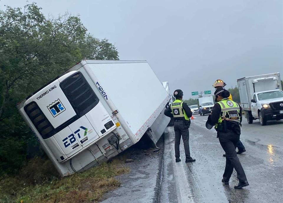 Un tráiler cagado con diversa mercancía terminó semivolcado, al salirse del camino, en un tramo carretero del municipio de Montemorelos.