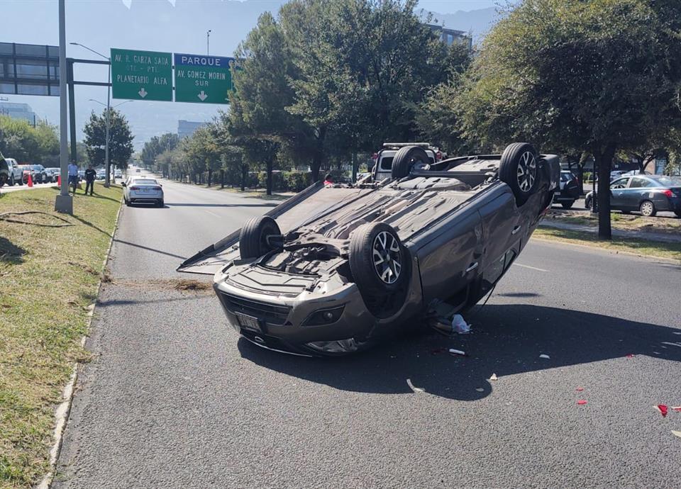 El conductor de un vehículo resultó lesionado luego de volcarse, ayer en la Avenida Gómez Morín, municipio de San Pedro.