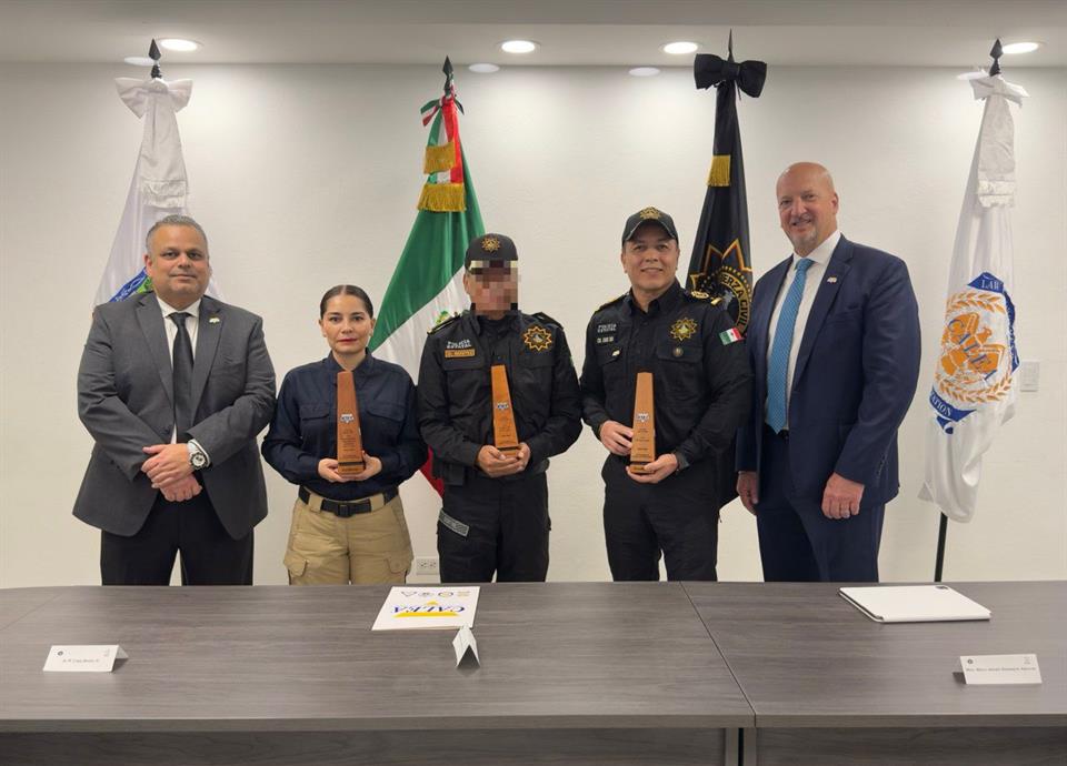 En el Campo Policial No 1; Craig Hartley, Jr., director ejecutivo de la Comisión de Acreditación para Agencias de Aplicación de la Ley, entregó el reconocimiento a Gerardo Escamilla Vargas, titular de la policía estatal.