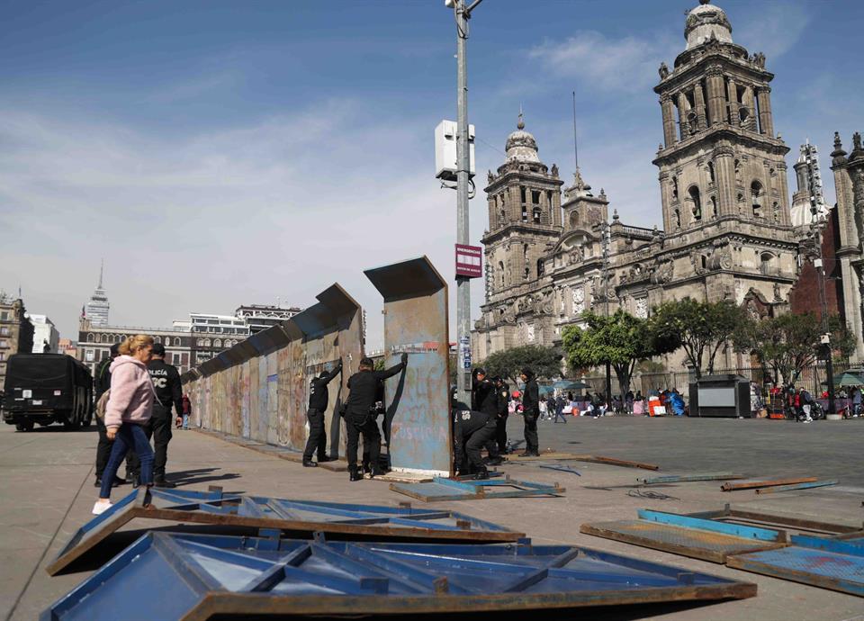 Las inmediaciones de la plancha amanecieron con bloques de concreto que conforman dos pesadas barreras destinadas a limitar el paso vehicular y peatonal. En vialidades como 16 de Septiembre, los muros de concreto fueron instalados de extremo a extremo, sumándose a las vallas metálicas que desde días anteriores ya se encontraban en el área.