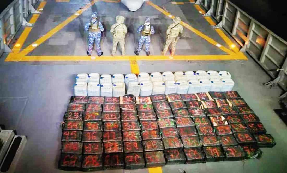 Además, se aseguró una segunda embarcación con tres motores fuera de borda y tres tripulantes a bordo, con 125 bidones con un volumen aproximado de 5 mil 950 litros de combustible y se lograron recuperar 49 bultos abandonados con un peso aproximado de 1 mil 102 kilogramos de presunta carga ilícita.