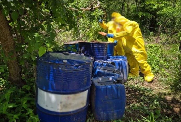 En otra acción, en el mismo municipio, se localizó e inhabilitó un área de concentración de insumos utilizados para la elaboración de metanfetamina, se aseguraron mil 50 litros de sustancias químicas. La afectación económica a la delincuencia organizada es de 21 millones de pesos.