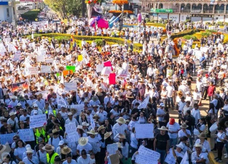 Miles de ciudadanos, vestidos de blanco en símbolo de paz y con sombreros en homenaje al ex alcalde asesinado Carlos Manzo, recorrieron este viernes las principales avenidas de Uruapan.