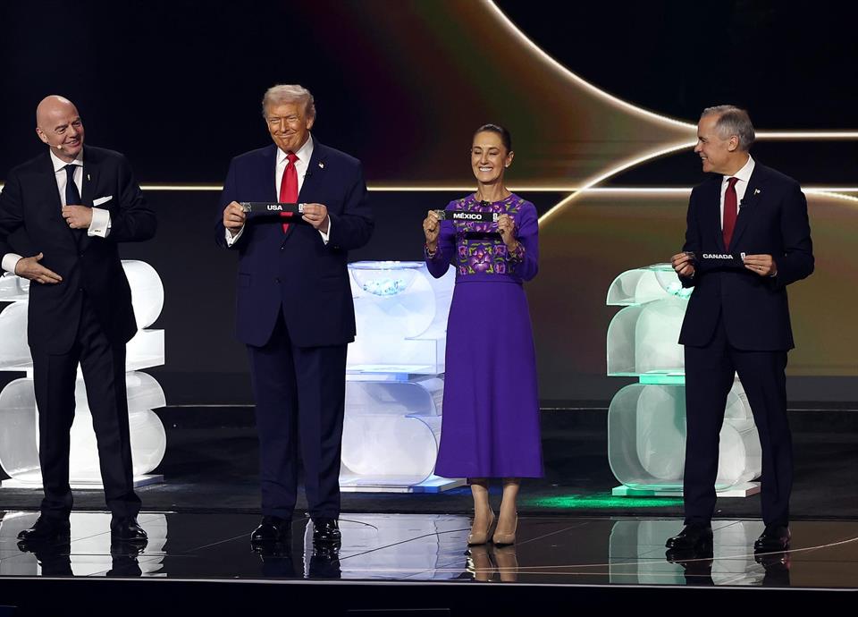 , Claudia Sheinbaum Pardo; el presidente de Estados Unidos, Donald Trump; y el primer ministro de Canadá, Mark Carney, coincidieron este viernes en un mismo escenario público durante el sorteo de la Copa Mundial de la FIFA 2026, que se realizará de manera conjunta entre los tres países.
