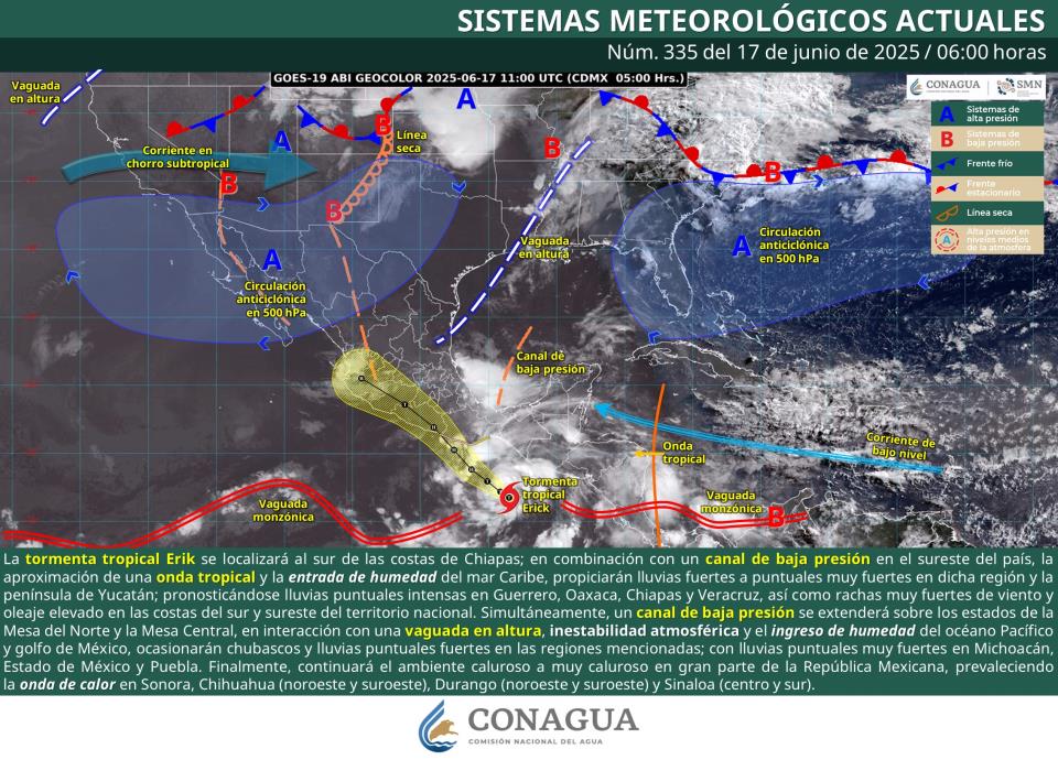 CIUDAD DE MÉXICO, junio 17 (EL UNIVERSAL).- Este martes, a las 03:00 horas (tiempo del centro de México), la depresión tropical Cinco-E se intensificó a tormenta tropical "Erick" en el océano Pacífico. Según el más reciente reporte de las 06:00 horas, el centro de "Erick" estaba ubicado a 325 kilómetros al sur-suroeste de Puerto Chiapas, Chiapas, y a 695 kilómetros al sureste de Punta Maldonado, Guerrero. Actualmente tiene vientos sostenidos de 65 kilómetros por hora, rachas de hasta 85 km/h, y se desplaza hacia el oeste-noroeste a 19 km/h.