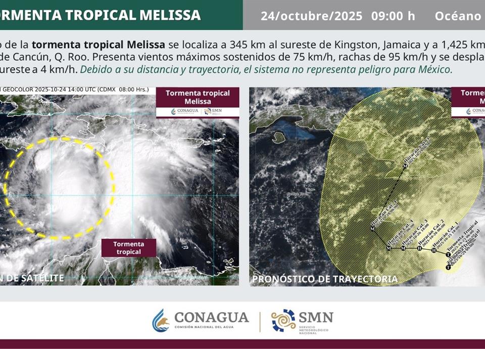 El Servicio Meteorológico Nacional (SMN) informó que "Melissa" no representa peligro para el territorio nacional, pues su trayectoria permanece confinada al Caribe central, sin señales de ingreso al Golfo de México.