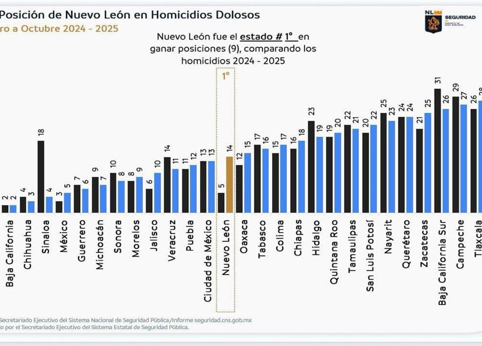"De acuerdo con la información, de enero a octubre de 2025, Nuevo León se ubica en el lugar número 14 en la estadística de los estados con más homicidios del país, lo que indica una gran reducción comparado con el año pasado", se informó.