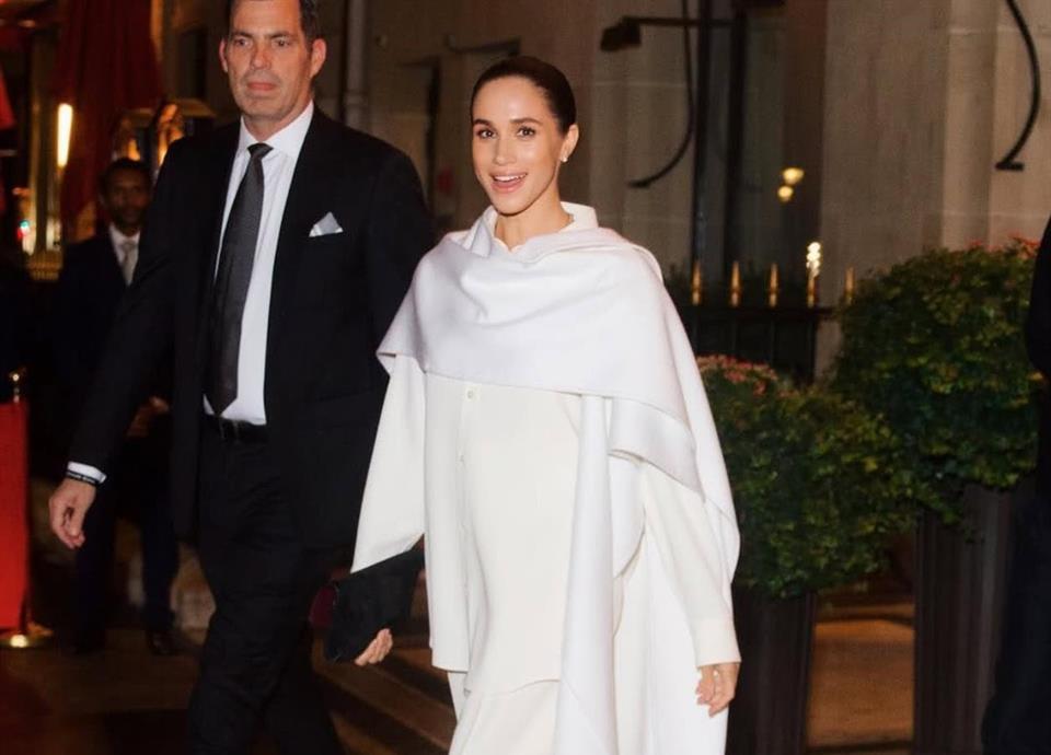 La ex protagonista de Suits optó por un conjunto impecable en blanco, una capa oversized de corte dramático sobre una camisa abotonada a juego, complementada con tacones negros de punta fina y un moño recogido que realzaba su silueta.