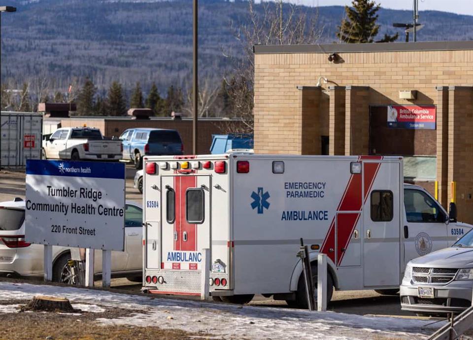 Ambulancias y equipos de emergencia permanecen en Tumbler Ridge tras el tiroteo que dejó ocho muertos y más de 20 heridos. (FOTO DE AFP)