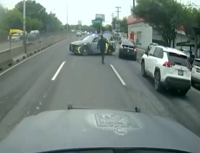 Asimismo, en las imágenes se muestra que una patrulla se cruza sobre la vía carretera para bloquearle el paso, pero el conductor lo esquiva y continúa su camino a toda velocidad por varios kilómetros.