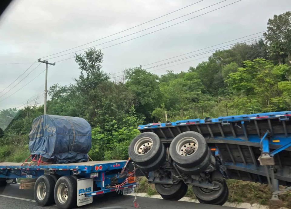 La Carretera Nacional en dirección hacia Montemorelos quedó colapsada por varias horas cuando se volcó la plataforma de un tráiler de carga pesada.