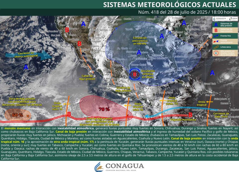 ) mantiene bajo vigilancia tres zonas de baja presión en el océano Pacífico con potencial de evolucionar a ciclones tropicales, mientras el monzón mexicano y varios canales de baja presión provocan lluvias, tormentas eléctricas y ambiente caluroso en buena parte del territorio nacional.