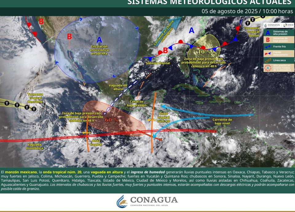 Por lo que también la Onda tropical número 20 se desplaza por el sureste del país que generará lluvias puntuales intensas en Chiapas, Tabasco, Oaxaca y Veracruz.