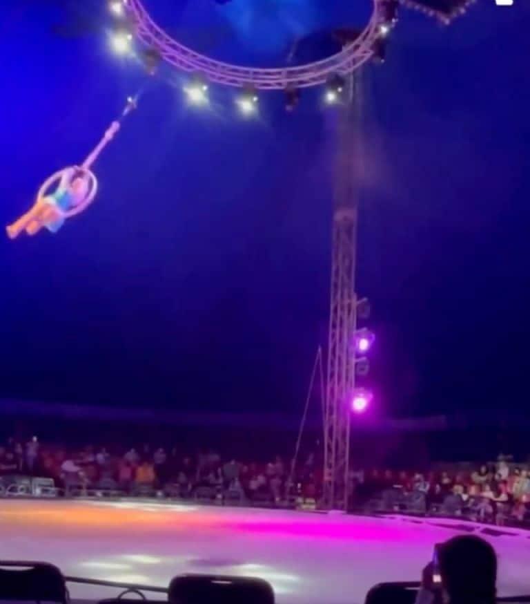 La caída ocasionó que la mujer quedará tendida y sin moverse en el suelo, por lo que otro empleado del circo se acerca rápidamente a auxiliarla mientras las luces se apagan. El accidente ocurrió el martes pasado durante una función del circo "Fantasy Word on Ice" ubicado en Tampico, Tamaulipas.